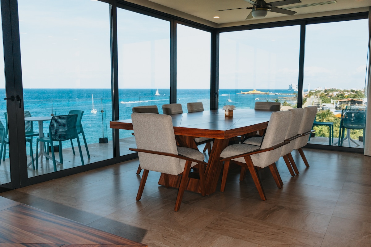 Pobjegnite u naš luksuzni dvosobni stan u srcu Cozumela! Sa zapanjujućim terasama, modernim dnevnim boravkom i visokokvalitetnim sadržajima, ovaj stan je savršeno mjesto za opuštanje i uživanje u miru na ostrvu. Opustite se ispred televizora ravnog ekrana, večerajte za elegantnim stolom za šest osoba ili pripremite vlastite obroke u potpuno opremljenoj kuhinji. Naše udobne spavaće sobe imaju bračne krevete, privatne terase i luksuznu posteljinu za miran san.