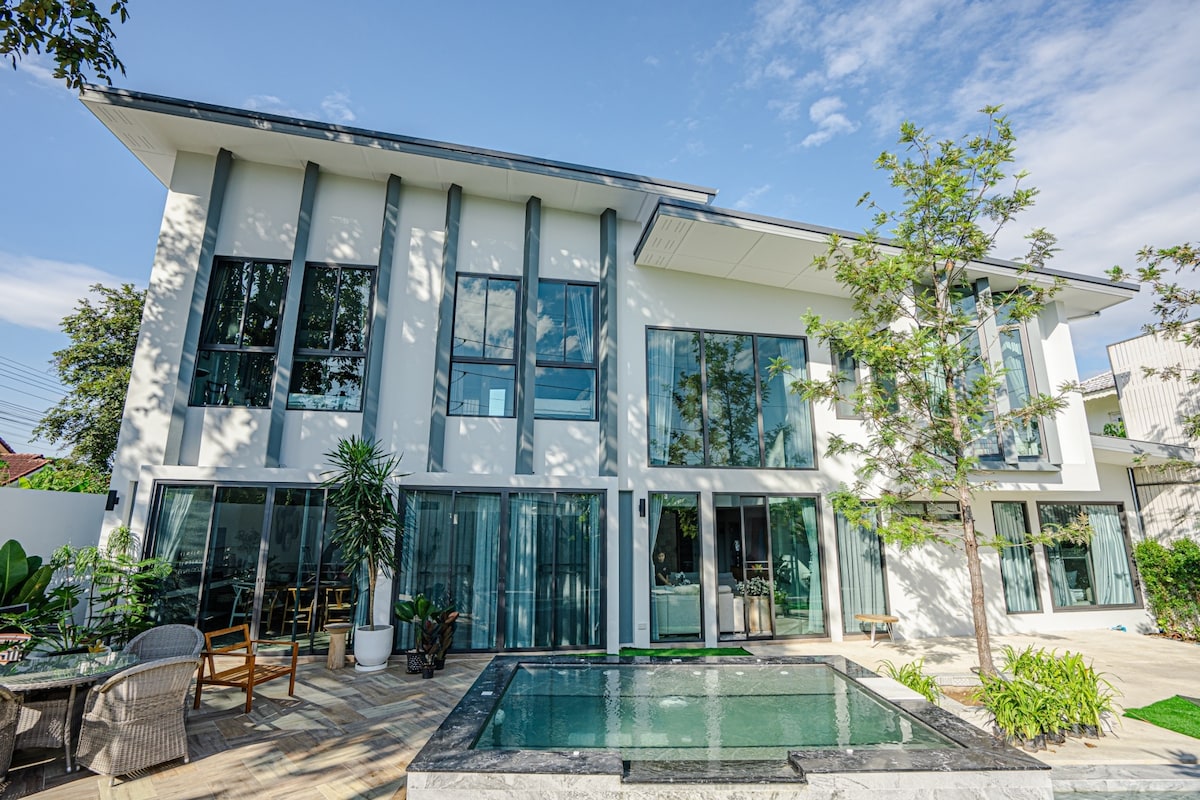 老城区地中海风格4房泳池别墅,附按摩池与花园|距离机场10分钟 欢迎来到您在清迈的地中海别墅一全新设计的四卧室豪华别墅。这座优雅的泳池别墅将现代舒适与宁静花园风格完美结合,特别适合家庭、朋友聚会、静修活动或特别节庆使用。 💡:特色亮点 🛏️四间宽敞卧室配备特大床(可舒适入住6-10人)四间卫浴附新毛巾与盥洗用品 🏊私人盐水泳池+按摩池角落与日光躺椅与超大露台 地中海风格花园,铺砖座位区适合户外用餐与下午🍴茶现代化全尺寸厨房:中岛流理台、冰箱、微波炉、烹饪餐具一应俱全 🛋️双层挑高客厅,采光良好,配有L型沙发床超大户外烤肉区,附8人以上餐桌 📺65吋4 K智慧电视,可观看NETFLiX/YouTube与高品质音响 🧺洗衣机与烘干机(BeKo智慧系统) 🚗免费停车位,可容纳2-3台车 宠物友善(需提前告知并酌收宠物费) 🛜全栋高速Wi-Fi无线上网 🕹️地理位置优势 ✅距离清迈国际机场仅10分钟车程 ✅10分钟内抵达清迈古城与夜市 ✅邻近多个热门景点.如长康路夜市.香格里拉酒店塔佩门. 帕辛寺 ✅门口有超市零距离、本地餐厅、咖啡馆与SPA(Spa)按摩店