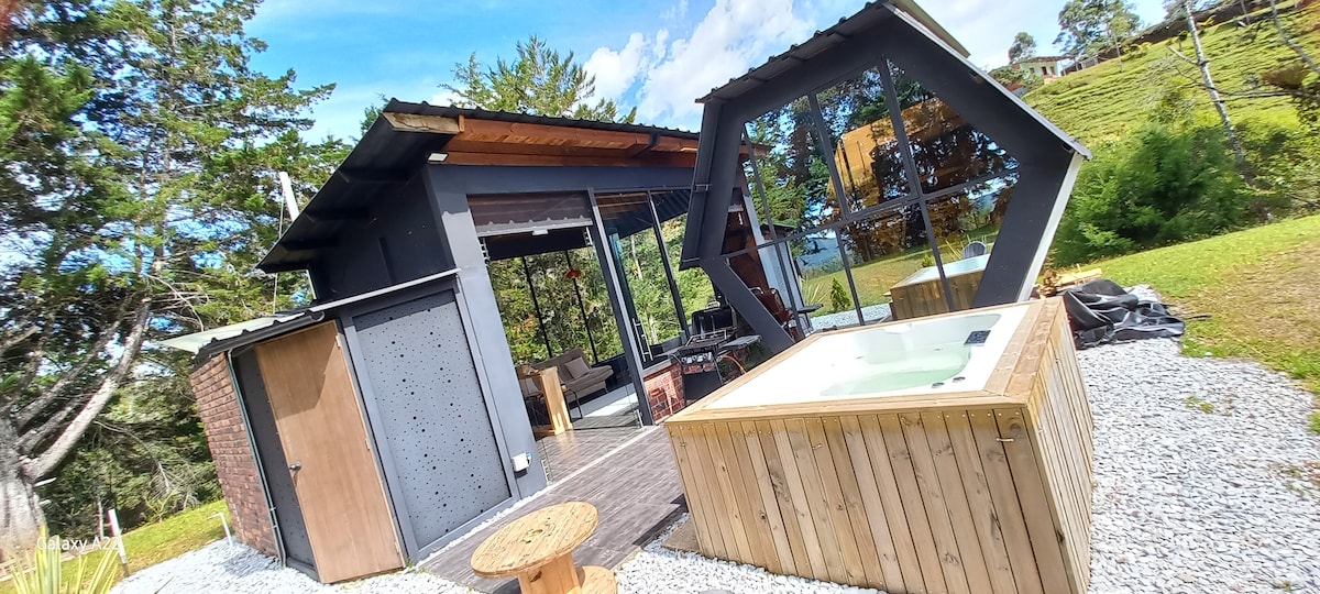 Refugio Monte Alpino Nativo, Cabaña Alpina con Jacuzzi privado, a una hora de Medellín y a 20 minutos del Aeropuerto. con un diseño exclusivo que te permitirá vivir una experiencia única, cálida, elegante, acogedora y privada. Desconéctate de la rutina y conéctate con la naturaleza. Sumérgete en un cálido baño en Jacuzzi, disfruta de un buen vino en la chimenea o en la fogata exterior, disfruta del aroma de la naturaleza y del paisaje! Te aseguramos que quedarás encantado con este lugar!