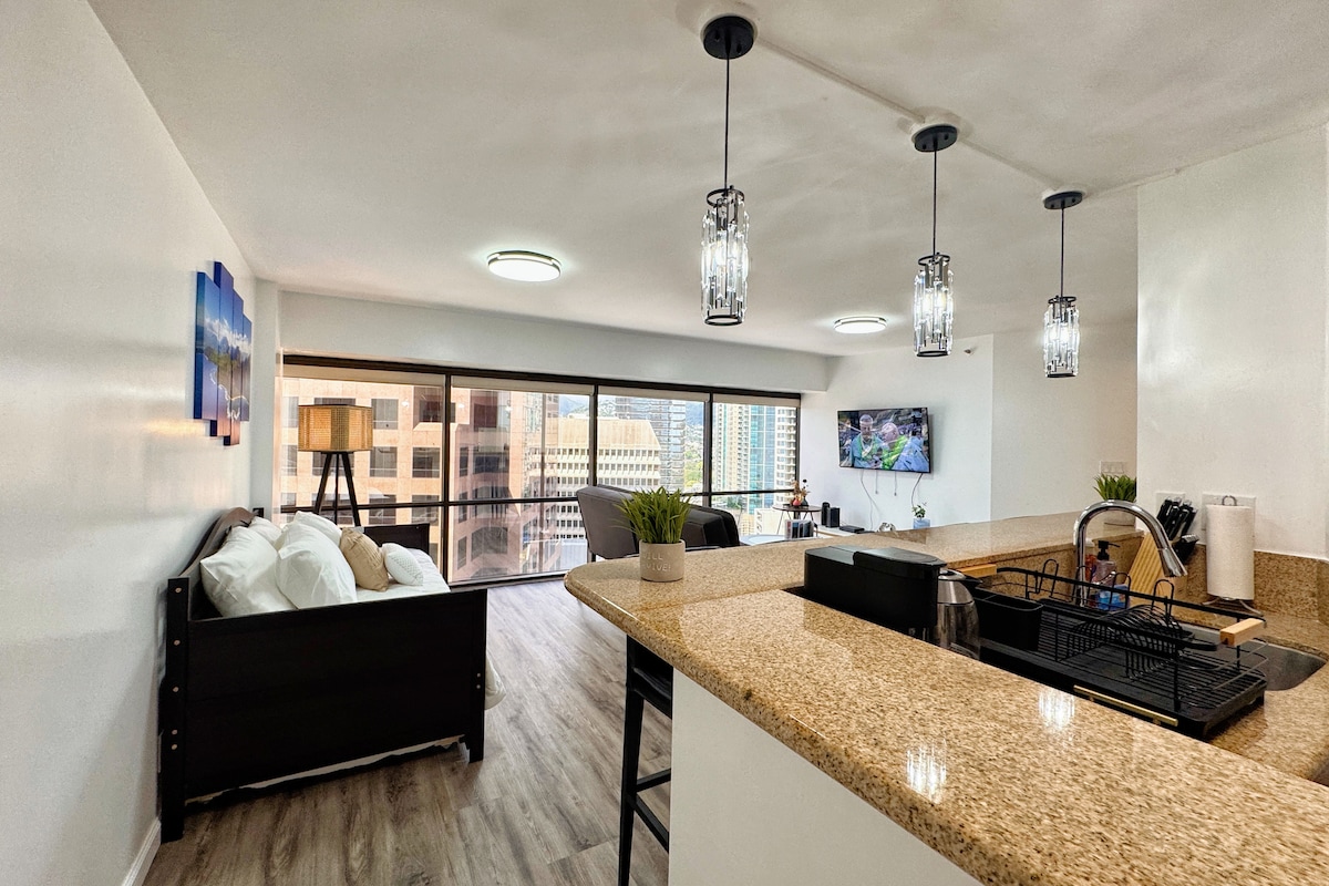 🏙️Moderni studio u centru grada | Epski pogledi + stil✨ Uživajte u panoramskim pogledima od poda do plafona iz ovog čistog, modernog studija u Executive Centru u centru Honolulua. Uživajte u prostranom rasporedu, elegantnom uređenju i svim pogodnostima koje su vam potrebne za produženi boravak, nekoliko koraka od trgovina, restorana i okeana. Savršeno za poslovne putnike ili istraživače ostrva koji traže udobnost i praktičnost u srcu grada.