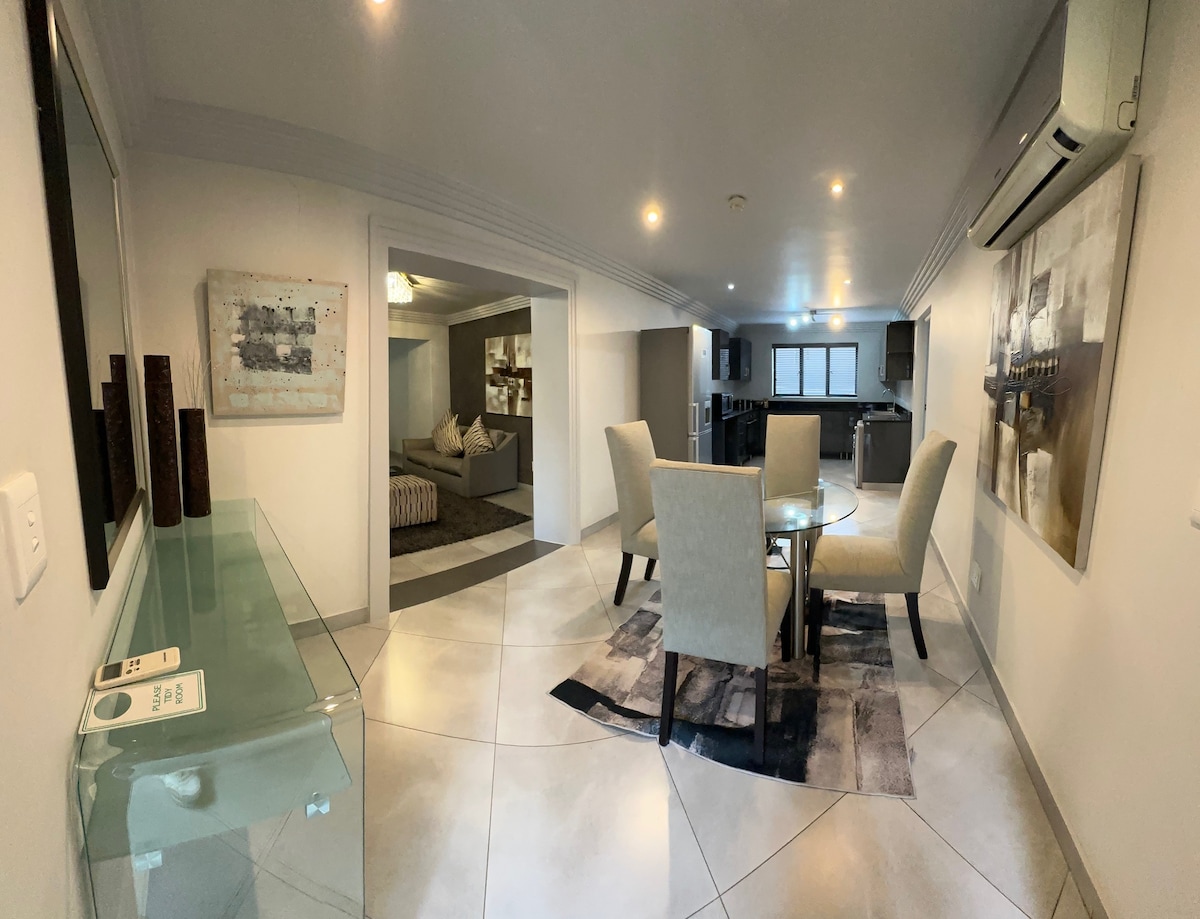 The smartly designed luxury one bedroom apartment is fully furnished with luxurious furnishes and has an open plan lounge and kitchen, small dining area and an en suite bedroom. The lounge and bedroom have its own flatscreen TVs and it is connected to satellite TV. Each room has its own air-conditioner - proving hot and cold air. The apartment is ±80sqm, fitted with Kingsize bed and it is fully equipped