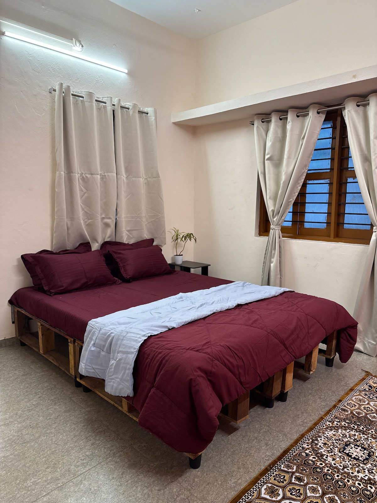 Drift into deep rest in a cozy bedroom that blends modern textures with soft lighting. Featuring a luxurious queen-sized bed with an upholstered headboard, a sleek full-length mirror, ambient pendant lights, and a serene circular wall niche, the space invites you to unplug and truly unwind. Whether you're reading under the warm glow of the pendant lights or waking up to a sunlit room, comfort meets aesthetics in every detail. The in-room AC and fan ensure a pleasant stay through all seasons.