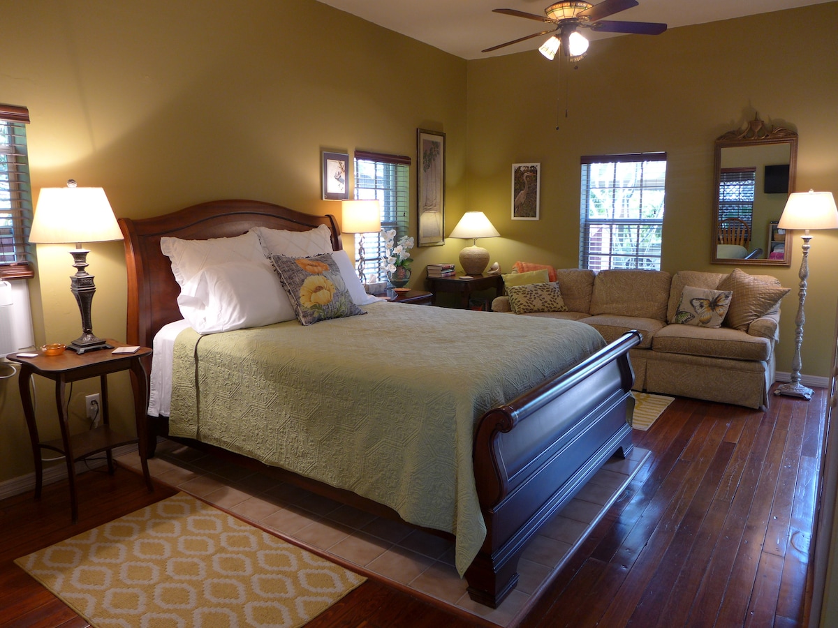 Green Palm Cottage se nalazi u vlasništvu našeg ličnog prebivališta. Ako želite privatni odmor, ovo je pravo mjesto za vas! Blizu svega , ali s osjećajem osamljenosti na našem bujnom, atraktivnom imanju, smještenom na kraju našeg popločanog prilaza od cigle. Prostrani studio s bračnim krevetom, udobnim kaučem itd. Preskočite dodatne naknade za prtljag; obezbijedili smo vam sve što vam je potrebno~ mašina za pranje/sušenje veša, peškiri za plažu, čaršav za plažu, oprema za plažu, frižideri, stolice, suncobrani, bicikli i još mnogo toga. Životinje i kućni ljubimci nisu dozvoljeni