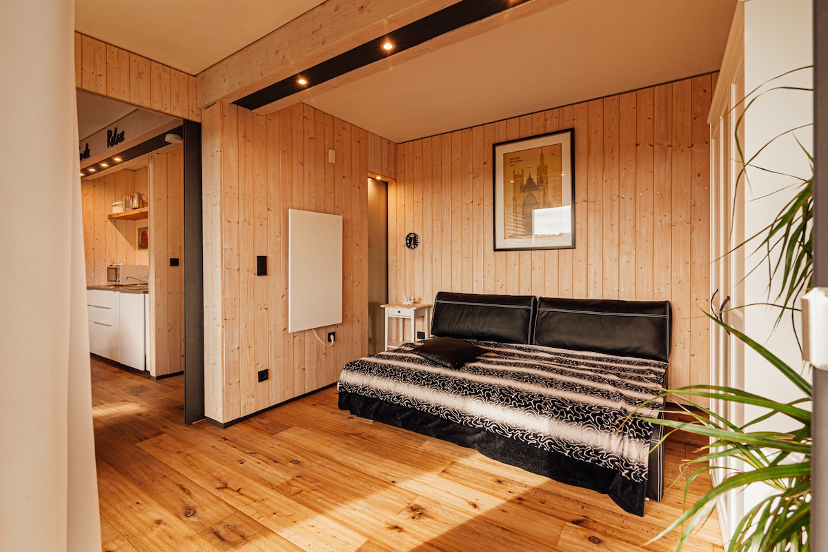 Stambeni prostor se proteže na dva sprata. U prizemlju se nalazi dnevni boravak/kuhinja sa šporetom na drva, kaučem i drvenim stolom, kao i mala kuhinja, koja je opremljena plinskom pločom za kuhanje i frižiderom. Stambeni prostor u prizemlju se nalazi pored drvene terase s prostorom za sjedenje. Na donjem spratu je i kupatilo sa tuš kabinom i WC-om. Prostrana spavaća soba na gornjem spratu je lako dostupna putem drvenih stepenica.
