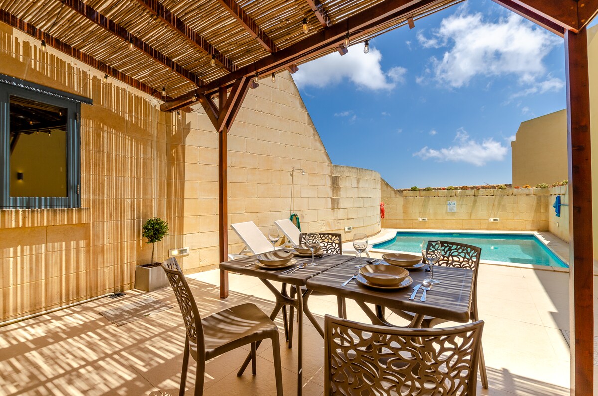 Pobjegnite u mirno okruženje Goza u našem jedinstvenom stanu u prizemlju koji se nalazi u slikovitom selu Xaghra. Naši gosti uživaju u korištenju privatnog bazena i zapanjujuće terase, zajedno s roštiljem i prostorom za objedovanje na otvorenom. Topla unutrašnjost nudi rijetku hidromasažnu kadu, punu kuhinju s mašinom za suđe, klima-uređaj, Smart TV i brzi Wi-Fi. Savršena baza za opuštajući odmor, privatan i osamljen, koji je još uvijek nadohvat ruke od užurbanog gradskog trga.