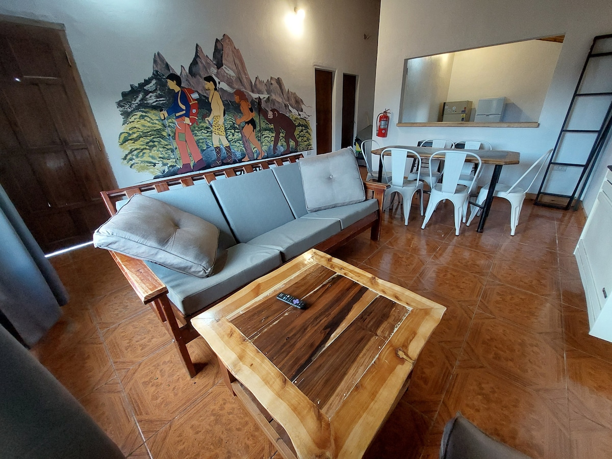 Disfruta de éste espacio con decoración vintage pensado para tener una acogedora estadía. Planta baja: Ambiente amplio con cocina completa, lavarropas, heladera, parrilla interior, baño, sommier de 1 y 1/2 plaza con cama marinera, mesa y sillas de comedor, TV led con crhomecast. Planta alta: Dormitorio Loft con sommier de 2 plazas, escritorio y Smart TV. Patio/Garage delantero y patio trasero pequeño con tobogán (compartido con los dueños). Sillas de camping con parrilla portátil.
