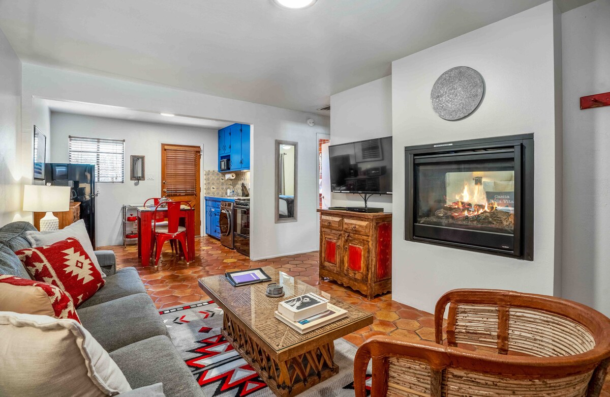 Kompleks Rio Vista nalazi se u srcu historijskog istočnog dijela Santa Fea, pored rijeke Santa Fe, i nedaleko od Canyon Road. Ovaj udoban stan s otvorenim tlocrtom s dvostrukim plinskim kaminom između spavaće sobe i dnevnog boravka koji pruža svjetlost i toplinu u cijeloj kući. Naši stanovi su besprijekorno čisti i prolaze kroz stroge procedure sterilisanja i dezinfekcije. Naša ekskluzivna domaćica slijedi smjernice CDC-a kako bi osigurala sigurno okruženje.