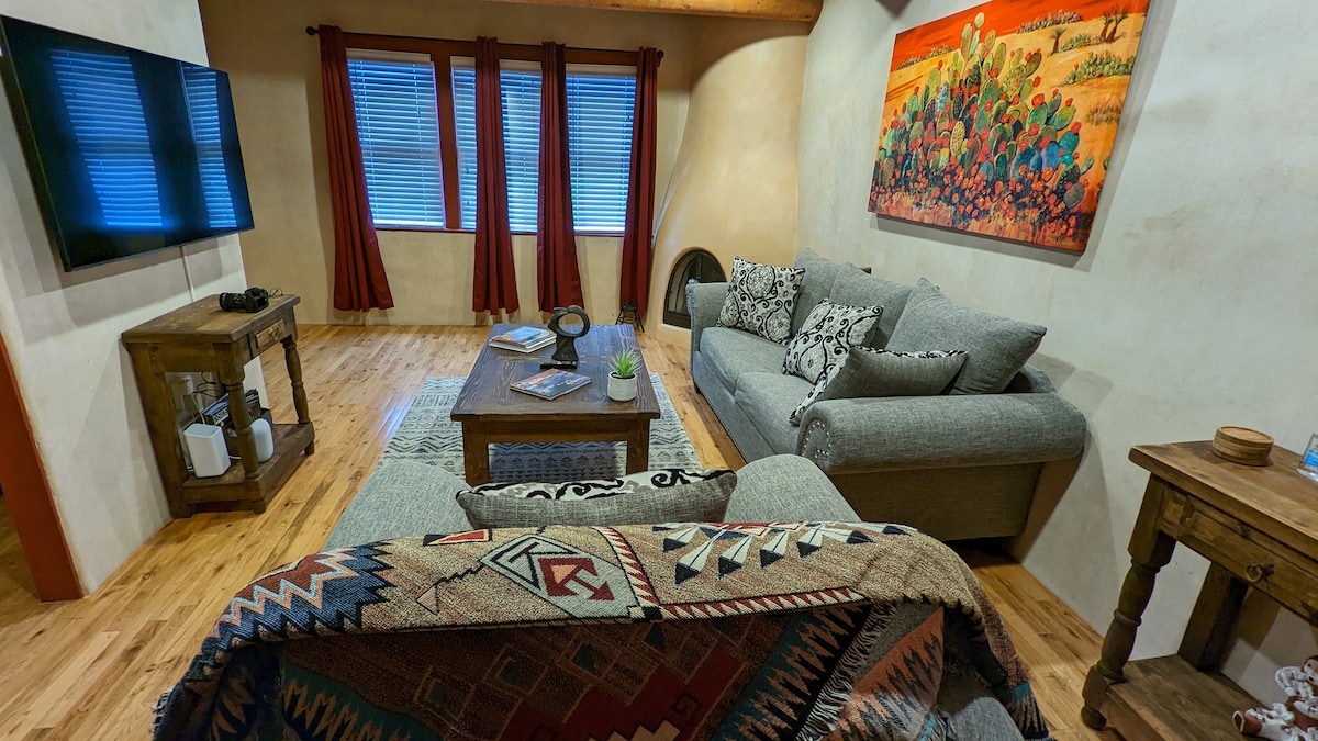 Prekrasan, nedavno preuređen i dobro opremljen stan s predivnim pogledom na planine s naše natkrivene verande u četvrti Casa Solana, sjeverno od historijskog centra grada. Udaljen je samo 5 minuta vožnje od trga Santa Fe, umjetničke četvrti Railyard, centra grada i muzeja Georgia O'Keeffe. To je pravi dragulj i ima udoban kiva kamin s adobe banco sjedištima, izloženim gredama, otmjenim Pueblo i španskim kolonijalnim vrhunskim detaljima. Posvećeni smo tome da vaš boravak bude prijatan i nezaboravan!