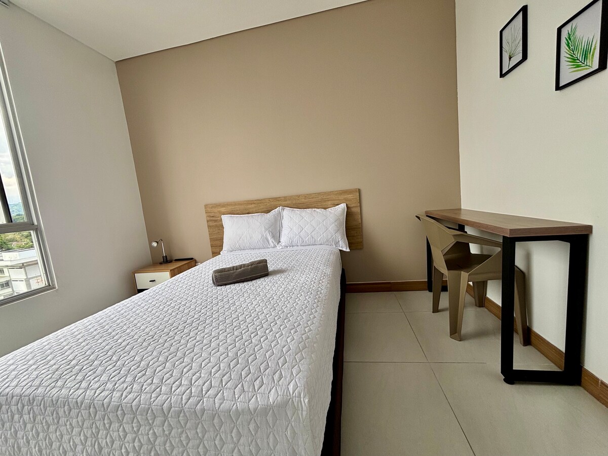 Doživite Plaza U doživljaj u ovom apartmanu na 6. spratu u Pereiri, idealnom za vašu udobnost. Opremljeno sa: 🛏️ Krevet za odmor. ✍️ Radni sto za rad ili učenje. 👕 Ormar, opremljena 🍳 čajna kuhinja i privatno 🚿 kupatilo. Uključuje: Wi-Fi s optičkim vlaknima, coworking, sobu za sastanke, terasu i vešeraj. VRLO blizu Tehnološkog univerziteta Pereira, klinika, kozmetičkih centara, prodavnica, restorana i Oxxa 24 sata dnevno. Savršeno za povezivanje i odmor! 🚀