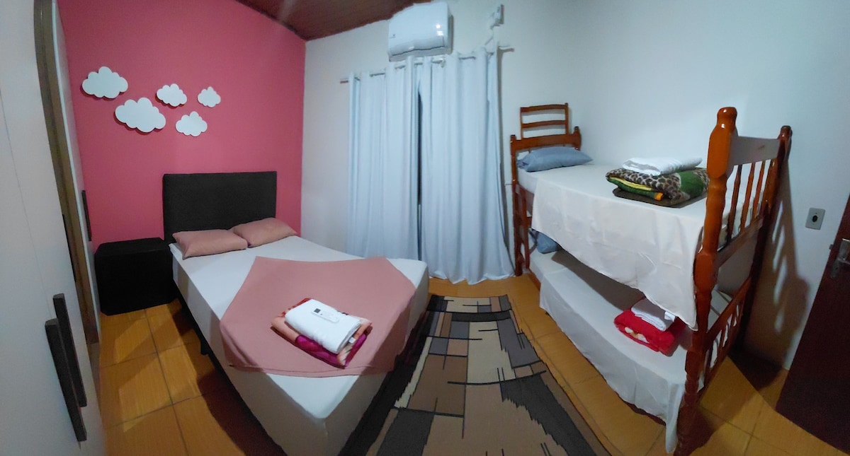 Alugo casa no centro da cidade, local com pátio todo fechado, garagem para um carro, porém no pátio cabem dois. localizada perto de mercado, farmácia e lancherias. Possui dois quartos com cama de casal, e disponibilizamos mais 2 colchões de casal e 1 de solteiro. Ar condicionado na sala e nos dois quartos. Local seguro. Alugo para argentinos.