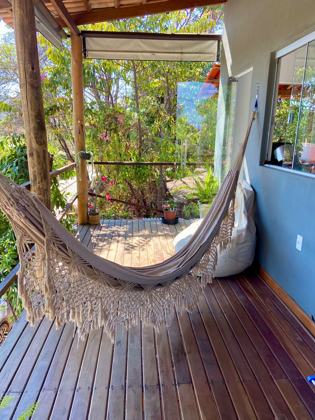 Bangalô de vidro e madeira aconchegante e privativo na mata rodeado de águas puras e natureza exuberante. Localizado num vilarejo muito especial, o Moinho, há 12 km de Alto Paraíso (estrada de terra), onde se encontra um ponto turístico fascinante, cachoeiras dos Anjos e Arcanjos. A hospedagem foi construída priorizando conforto e privacidade. Ideal para casais. Além da jacuzzi na varanda, os hospedes podem aproveitar de um banho de rio e tomar sol no deck que fica a apenas 50 m do bangalô.