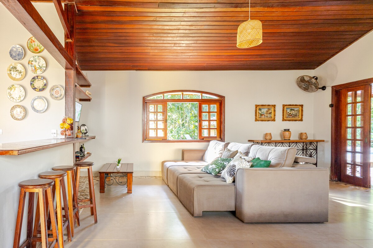 Opustite se s cijelom porodicom u ovom elegantnom smještaju. Smješten na jednoj od najtiših plaža na sjevernoj obali SP-a, s 5 spavaćih soba, 3 apartmana, bazenom s pogledom na šumu. Od kuće do plaže udaljen je 200 metara od vrlo zelene šetnje, ptica i svježeg zraka! CONDOMÍNIO ASSOCIAÇÃO DOS AMIGOS DE GUARATUBA. Napomena: U kući nema posteljine i posteljine za kupanje. Mi obezbjeđujemo Traveisseiros.
