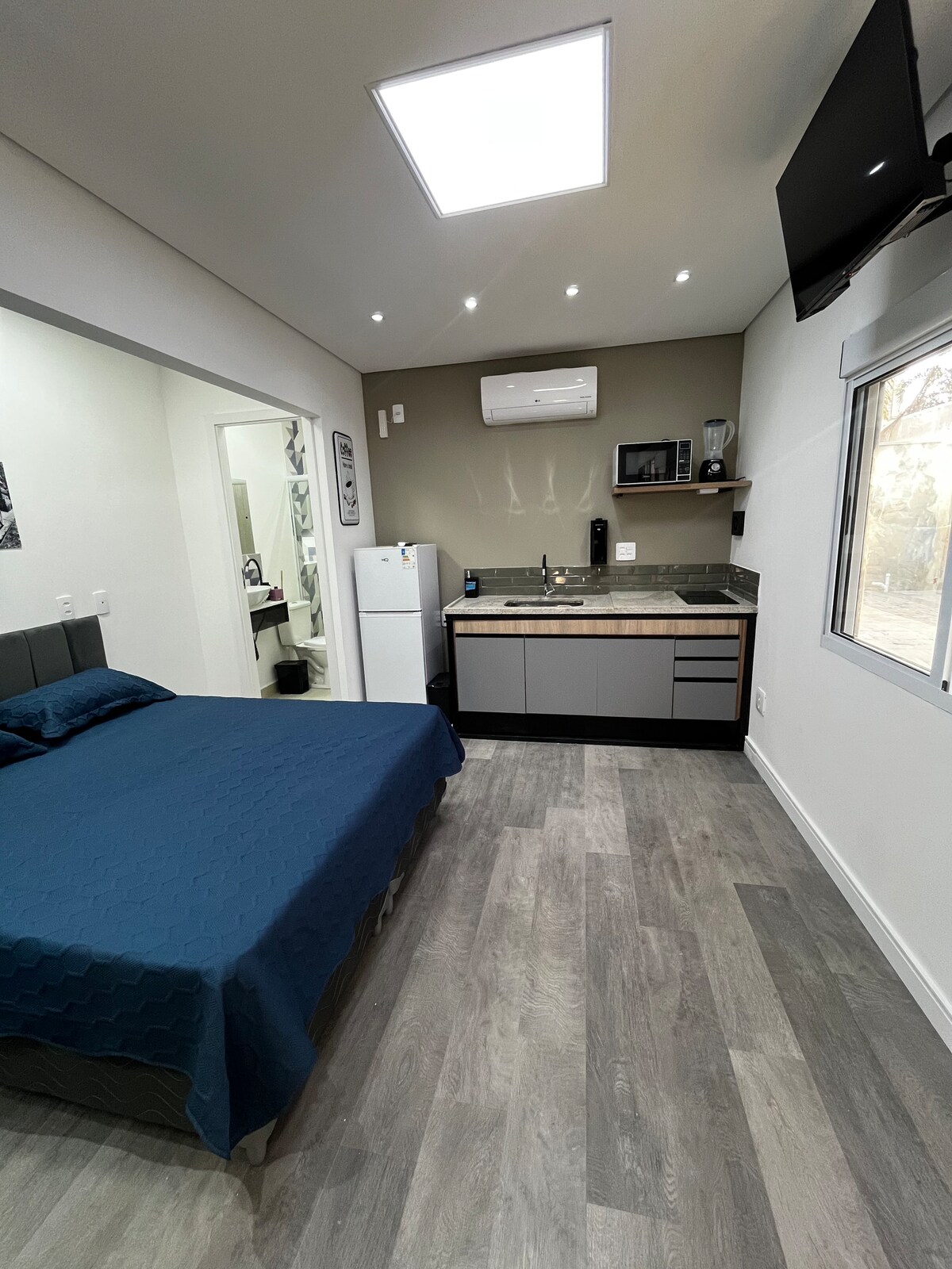 Kompaktan stan od 20m² idealan za praktičan i udoban boravak. Ima udoban bračni krevet, savršen za dobar noćni odmor i klima uređaj koji garantuje termalnu udobnost. Čajna kuhinja je funkcionalna i opremljena mikrovalnom pećnicom, sudoperom i osnovnim priborom, što pruža praktičnost za pripremu brzih obroka. Kupatilo je privatno, s tuš kabinom i dovoljno prostora za udobnost.