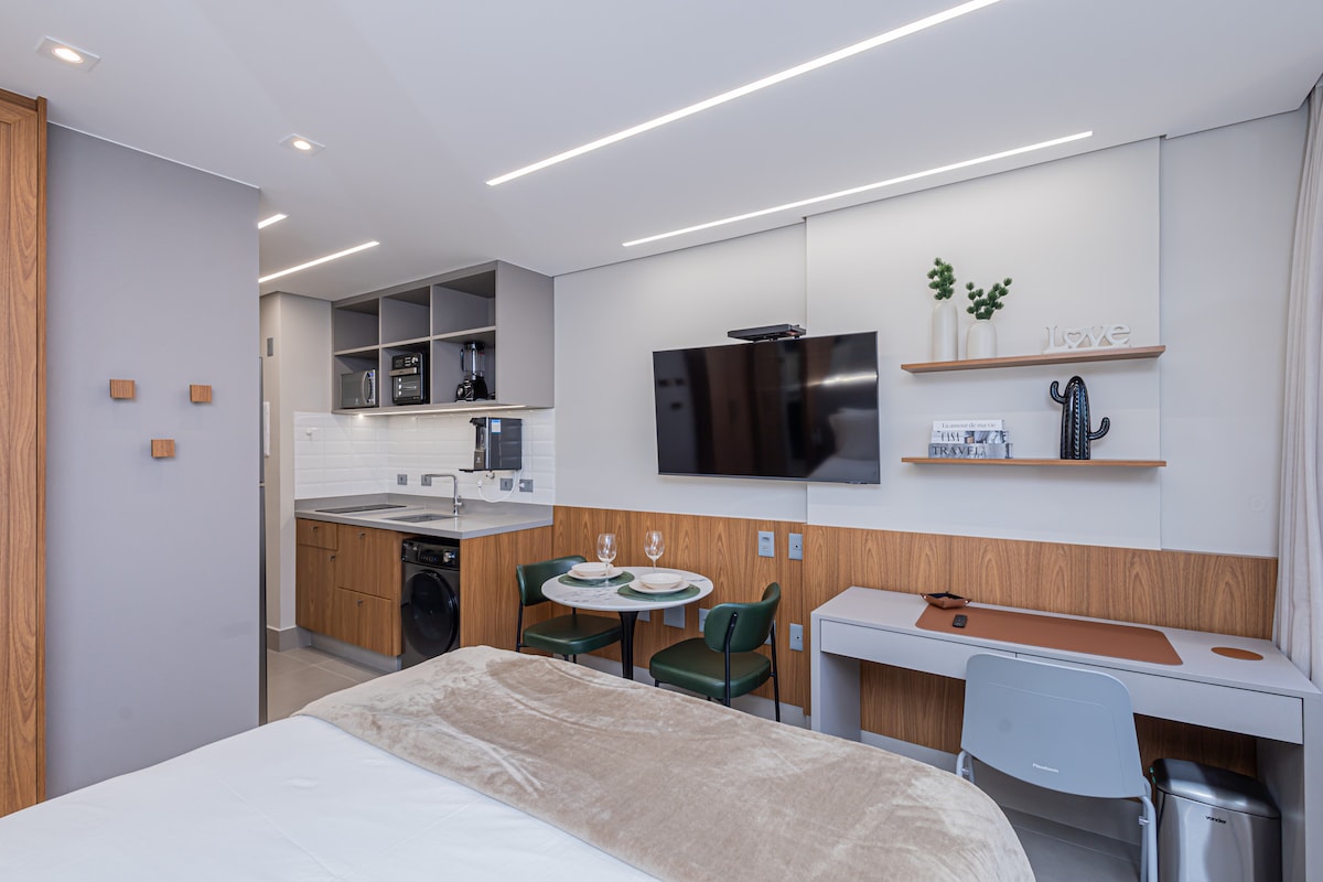 Potpuno novi stan, sa savremenim stilom, visokog standarda i na vrlo dobroj lokaciji, s privilegovanim pogledom na Allianz Parque. Pored tržnih centara, različitih firmi, prevoznih sredstava, parkova, turističkih atrakcija i poslovnih zgrada. Studio je kompletan, s udobnim bračnim krevetom, Smart TV-om i internetom. Kuhinja sa svim priborom, pločom za kuhanje, frižiderom i mikrovalnom pećnicom. S parkingom (rotirajućim). Blizu svega, udoban, savršen za uživanje u fantastičnim trenucima.