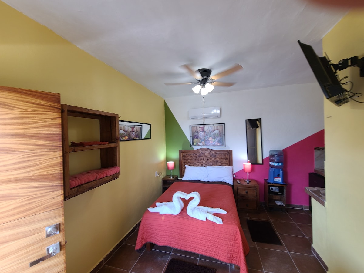 Uživajte u ovoj rustikalnoj sobi s bračnim krevetom, klima-uređajem i zadivljujućim pogledom na okean. Samo jedan blok od plaže, smješten na trećem spratu, ovaj prostor je idealan za one koji traže opuštanje i spokoj u San Panchu. Uz ugodnu atmosferu i sve potrebne sadržaje, savršen je za miran i udoban boravak na obali.
