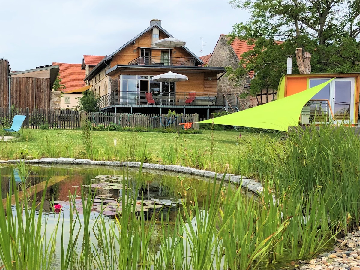 Smješteno u idiličnom okruženju Turinganske šume, naše šumsko potkrovlje od 70 m² s terasom od 30 m² nudi slikovito utočište za umjetnike, parove i slobodnog duha. Prepustite se uspavljivanju uz pucketanje kamina i probudite se uz cvrkut ptica. Bilo da se radi o kreativnoj inspiraciji, romantičnim trenucima ili istraživanju prirode, pronaći ćete savršeno mjesto za odmor na našem imanju od 2000 kvadratnih metara.