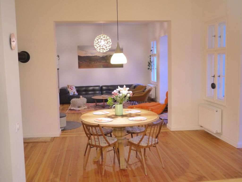 Veliki zatvoreni dnevni prostor (1 soba s kupatilom) u samostojećoj kući na 1. spratu, s kupatilom, kuhinjom i velikom terasom. Stan ima vlastiti ulaz i veličine je oko 60 m ². Objektu se pristupa putem prekrasnog vrta. Kuća se nalazi u mirnoj sporednoj ulici. Parking je obično dostupan na ulici. U slučaju nužde u susjednoj ulici uz kratku šetnju.