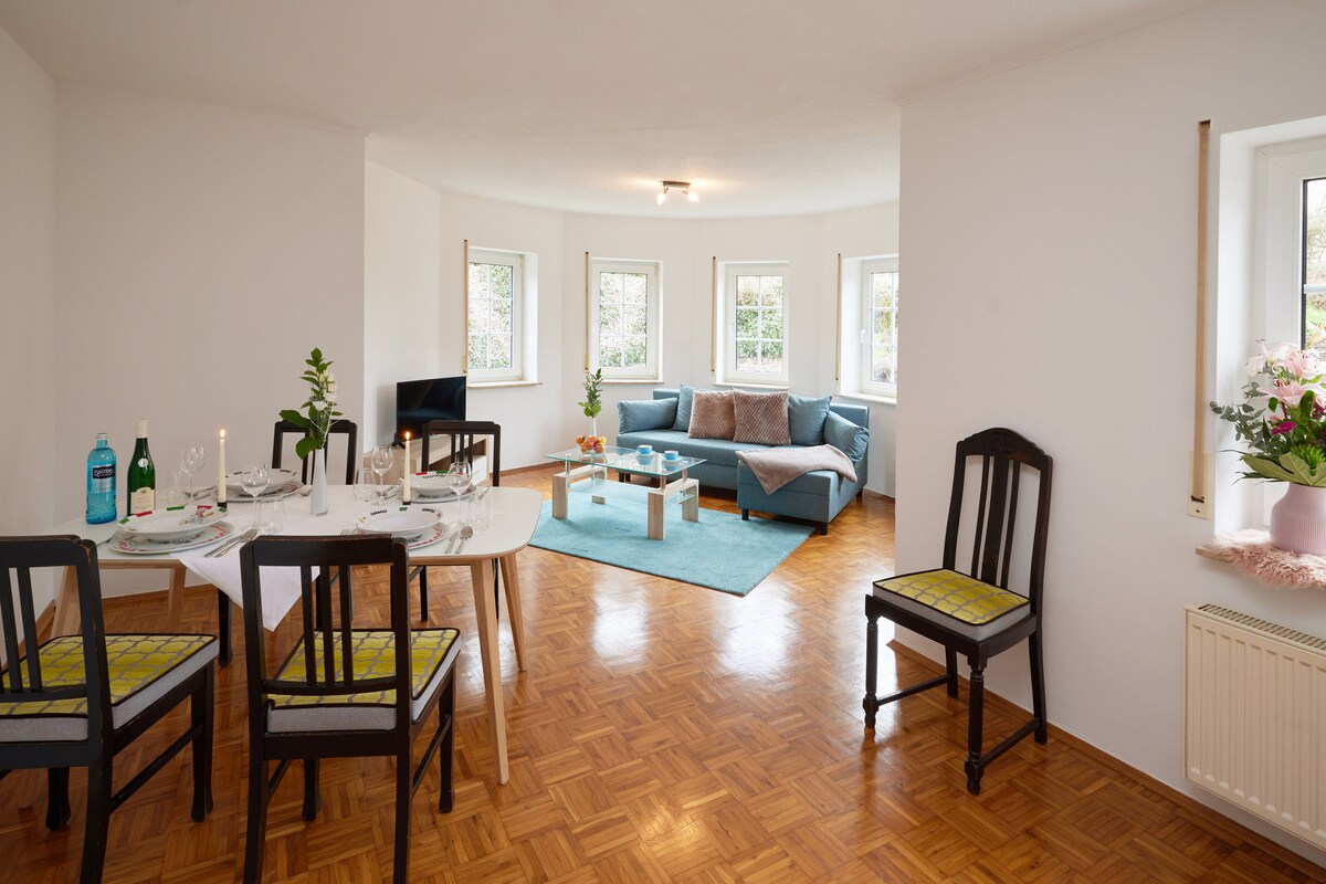 Dobro došli! Naša bivša seoska kuća, čiji temelji datiraju iz 18. vijeka, okružena je zelenilom sa svojom velikom seoskom kućom. Potok teče odmah iza kuće kroz prirodni rezervat, a brdoviti pejzaž s livadama i šumama poziva vas na pješačenje sa uvijek novim pogledima. Sam osunčani stan, sa starim podnim daskama i blagom 3 generacije, idealan je za porodice ili prijatelje i sve one koji traže mir i prirodu, bilo da se opuste ili rade.