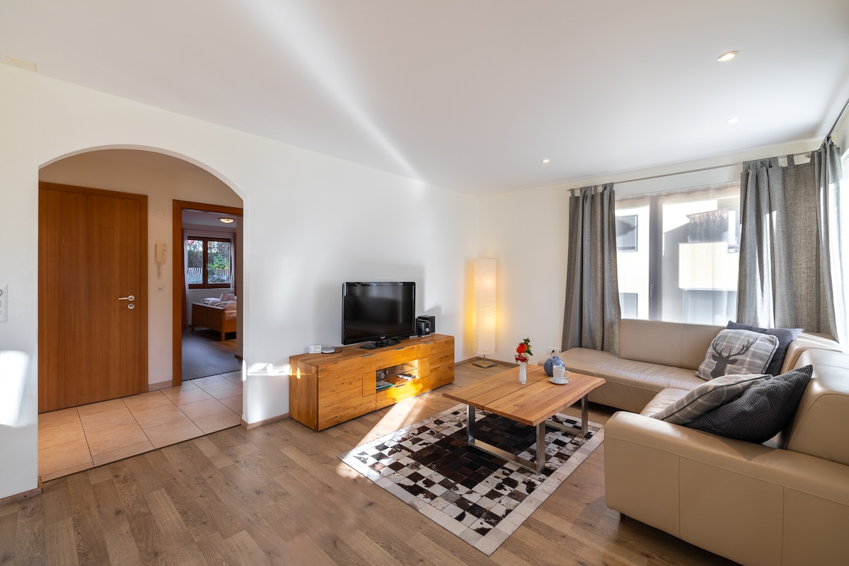 Uživajte u impresivnom panoramskom pogledu iz vašeg udobnog stana, usred veličanstvenog planinskog svijeta, daleko od gužve svakodnevnice. Čeka vas, kvalitetan namještaj s mnogo ljubavnih detalja. Otvorena, potpuno opremljena kuhinja sa susjednim osvijetljenim, modernim dnevnim prostorom čeka na umjetnike kuhanja. Dvije spavaće sobe sa bračnim krevetima vas pozivaju na opuštenu noć. Ljeti je udobno mjesto spremno za naše goste.