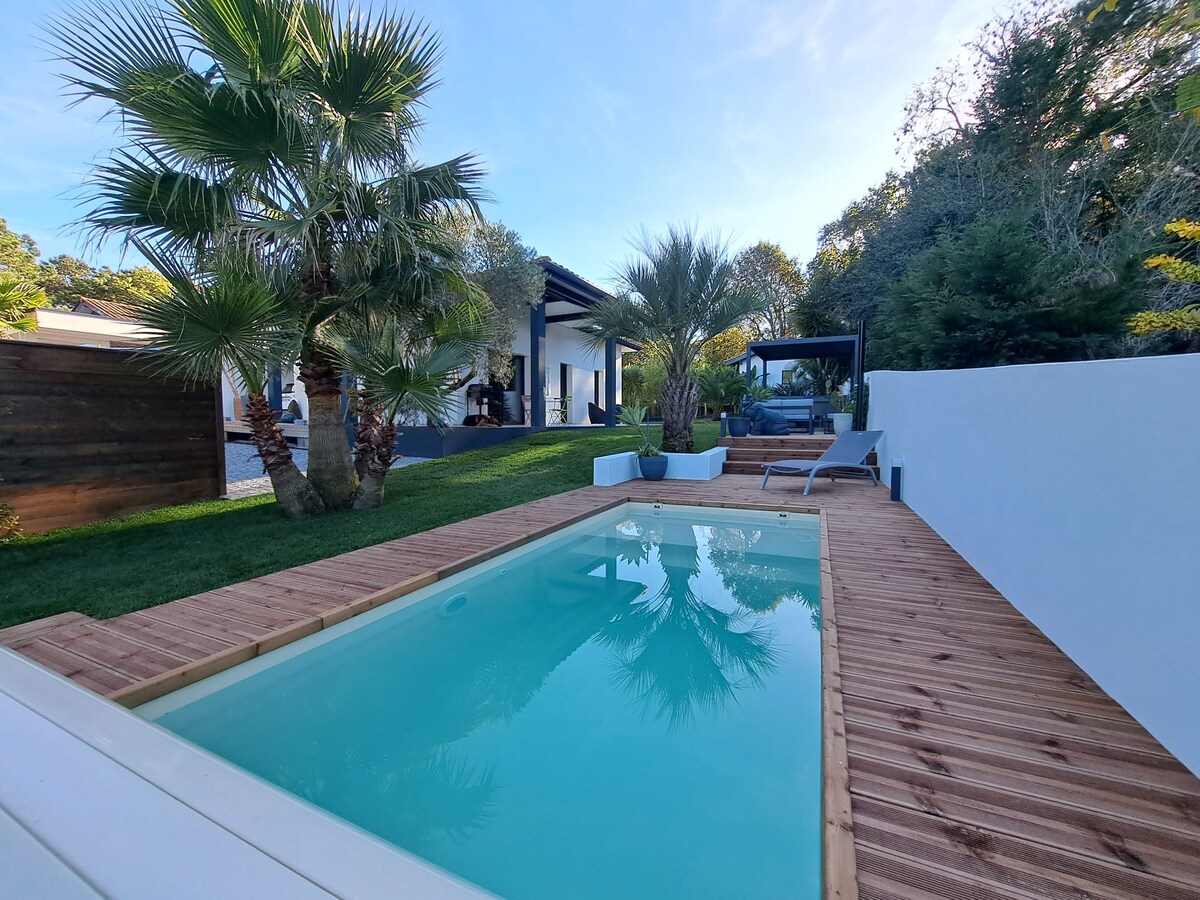 Chalet neuf de 60 m2 dans un parc résidentiel avec piscine chauffée et couverte avec dôme rétractable en été, espace bien-être et terrain multisport. A 15 kms des célèbres plages de Hossegor, Capbreton, Labenne, au milieu de la campagne Landaise, proximité des pistes cyclables et commerces ( producteur locaux et supermarchés). Terrasse exposée plein sud au calme sans vis à vis devant et terrain en herbes. La piscine et l’espace détente sont ouvert des vacances d’avril au vacances de la Toussaint