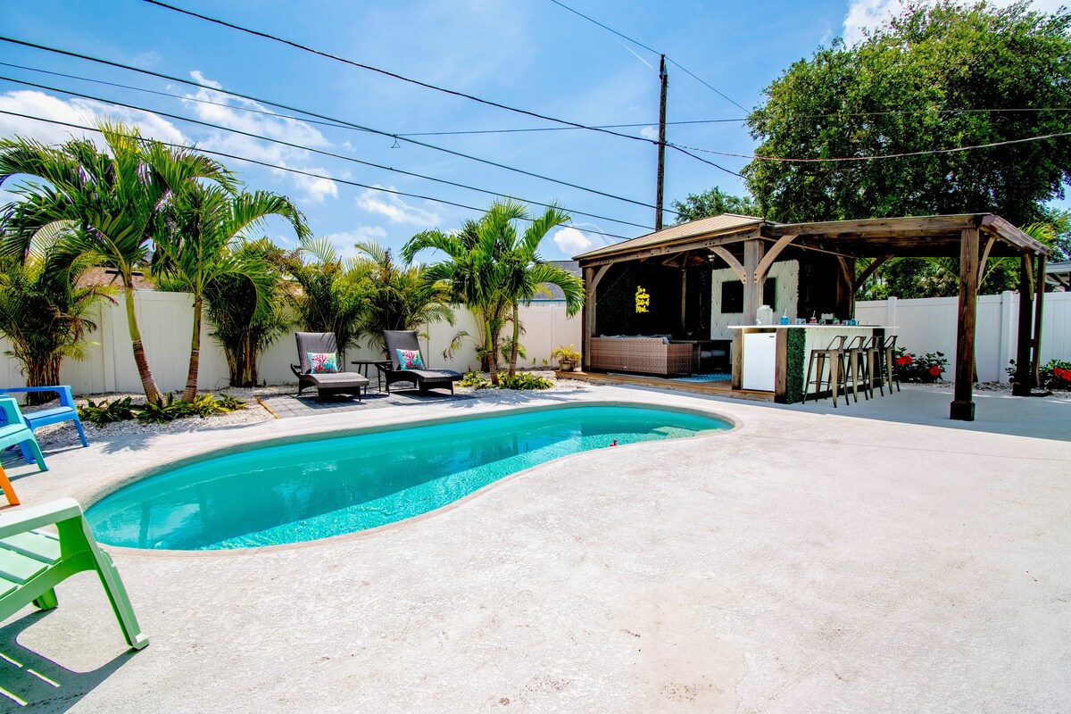 UTOPIA best describes this perfect single story VACATION HOME ! 5 MINUTE DRIVE TO BEACHES!! HUGE AMAZING RESORT SYTLE FREE HEATED POOL with LUXURIOUS PERGOLA, HOT TUB , TIKI BAR and plenty of outdoor seating perfect for soaking up the Florida sun ! Large 3 bedroom 3 bath pool home. Pool heat starts Oct 15 and runs thru april 15 seasonally for FREE( heats 80-85 degrees) large four person hot tub is hot and ready at 101° upon your arrival. No waiting on a hot tub to heat up!