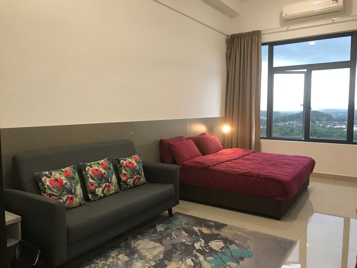 Istražite naš udobni studio apartman koji može primiti 2 do 3 osobe s bračnim krevetom i kaučem na razvlačenje. Samo 15 minuta vožnje od KLIA T1/T2, mjesto je okruženo mnogim restoranima, podružnicama brze hrane, namirnicama i vešernicama, a sve je na pješačkoj udaljenosti. Uživajte u svim sadržajima, uključujući dječje igralište, prostor za roštilj, teretanu i bazen, uz osiguranje 0-24. * Nije dostupno, ostavite prtljag prije vremena dolaska. Zbog dizajnirane zgrade, morate hodati stepenicama od 10 stepenica da biste došli do lifta.