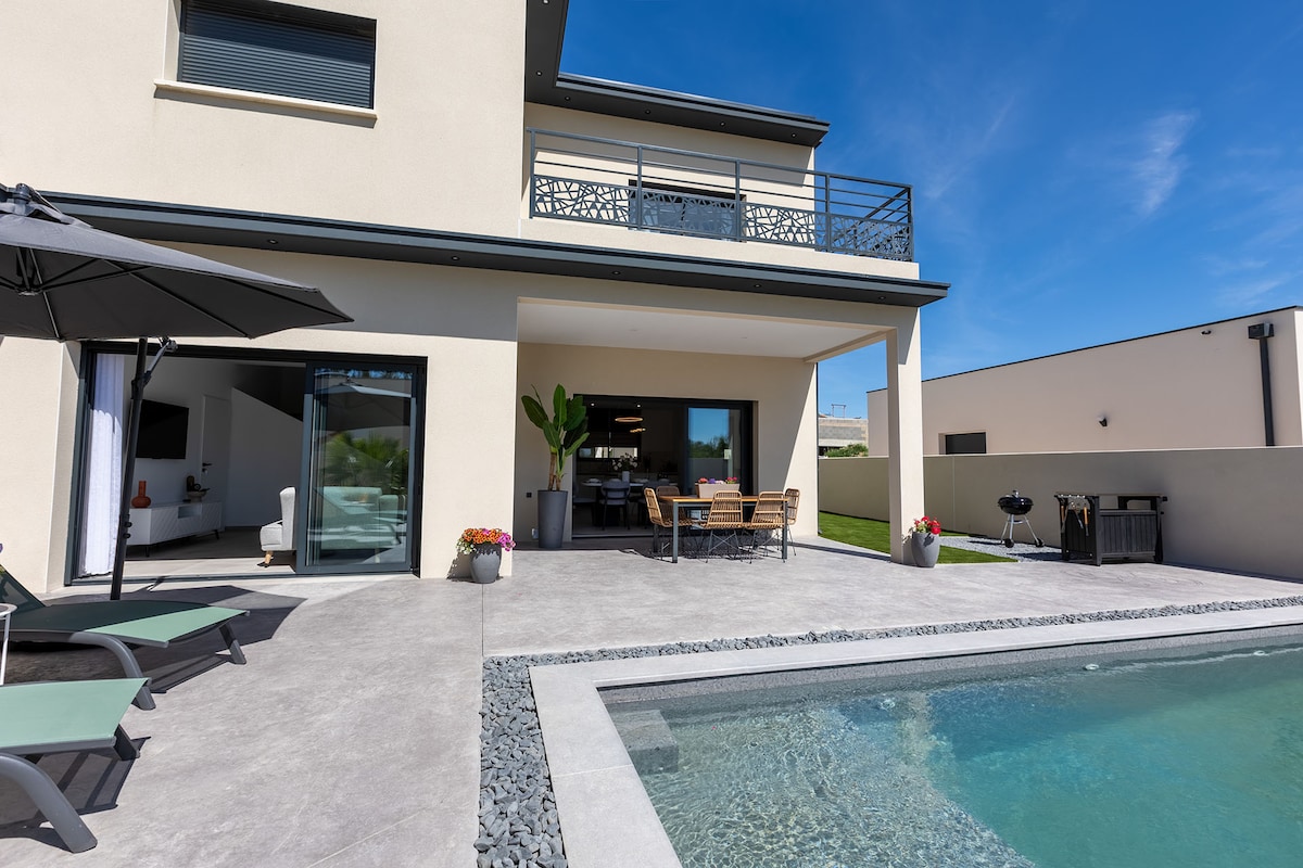 Villa Miray – klasifikovan namješten smještaj ★★★ u Sérignanu. Nova kuća od 118 m², 3 klimatizovane spavaće sobe, 3 bračna kreveta + kauč na razvlačenje. Privatni bazen, uređen vrt, terasa, vanjski tuš i WC. Plaža 15 minuta hoda, trgovine u blizini. Potpuno opremljena kuhinja, svijetla dnevna soba, moderna udobnost, tišina i privatnost. Idealno za porodice i prijatelje, do 8 gostiju. Potpuni klima uređaj.
