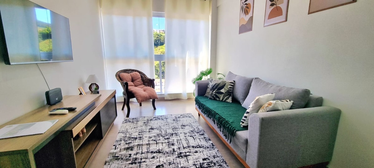 Sofisticado, aconchegante e romântico, localizado no centro. Finamente decorado e equipado. Apartamento diferenciado, com uma confortável suíte com cama queen e TV. Segundo quarto com duas camas de solteiro. Amplo banheiro social com ducha. Living com Smar TV de 55" e lareira. WiFi. Varanda com vista para a cidade e montanhas. Sala de jantar aconchegante e aquecedor. Cozinha planejada com lava-pratos. Despensa completa com lava-roupas. Ideal para uma estadia romântica ou com a família.