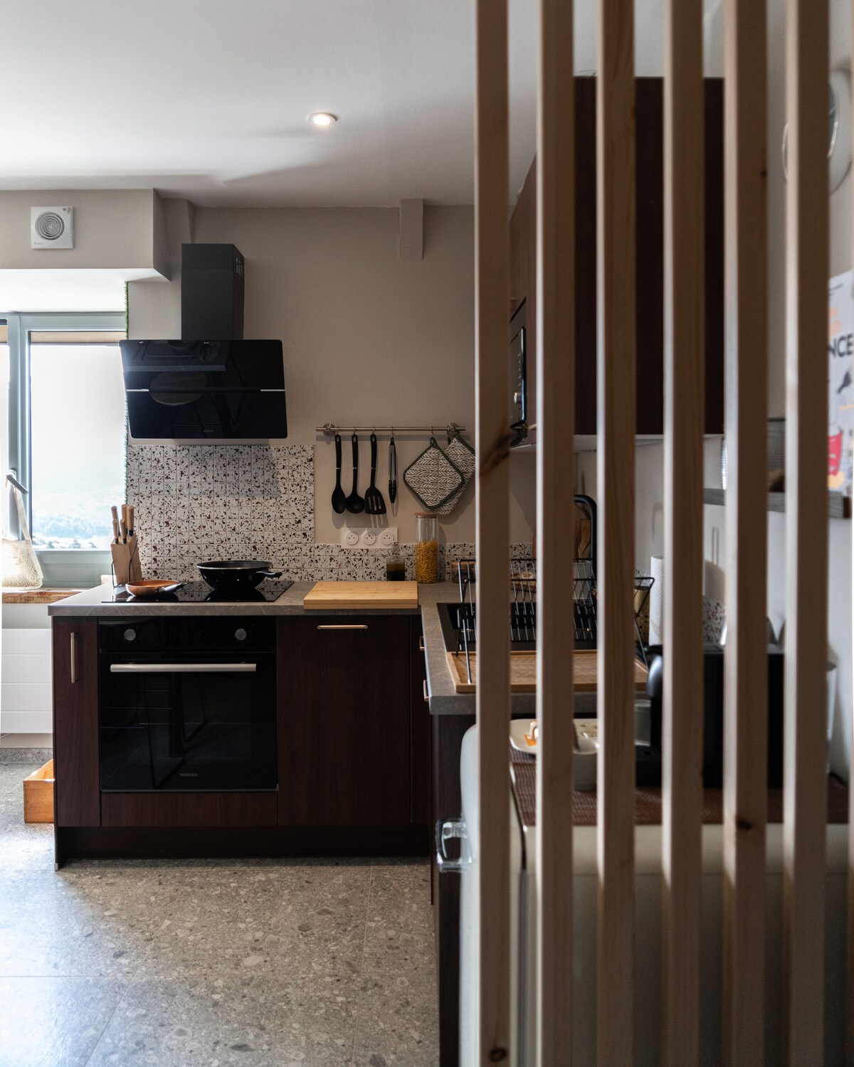 Ovo minimalističko potkrovlje će inspirisati spokoj čim uđete. Bit ćete uronjeni u prostrano i svijetlo okruženje, zahvaljujući velikim prozorima koji nude zadivljujući pogled na planine. Kolonijalni krevet s četiri postera postaje srce stana, stvarajući udoban i romantičan prostor. Kuhinja, opremljena keramičkom pločom za kuhanje, idealna je za pripremu vaših omiljenih jela, dok vam trpezarija u centru sobe pruža savršen prostor za uživanje u obroku s pogledom.