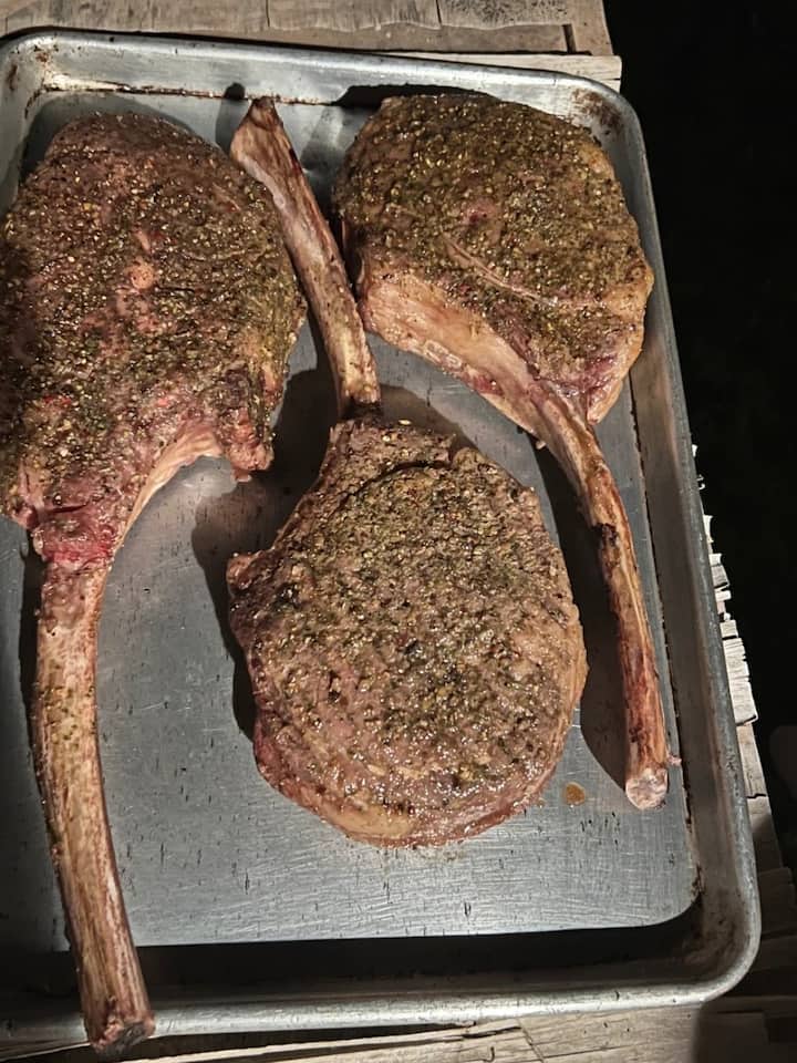 Uživajte u kompletnoj večeri s odreskom koja uključuje koktel od škampa i pikantne knedle od piletine za početak, nakon čega slijedi svježa baby gem Caesar salata. Glavno jelo uključuje brokoli s bademima, pire krompir sa bijelim lukom, peciva i ribeye tomahawk odrezak s kosti. Za kraj, bogata čokoladna torta s sosom od malina.