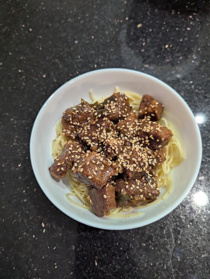 Uživajte u ovom jelu koje uključuje svježe, kvalitetne sastojke, kao što su sake, mladi luk, soja sos, cimet i sjemenke susama, u kombinaciji s tradicionalnim azijskim rezancima. Stvara obilan, ukusan gulaš, idealan za ručak ili večeru.