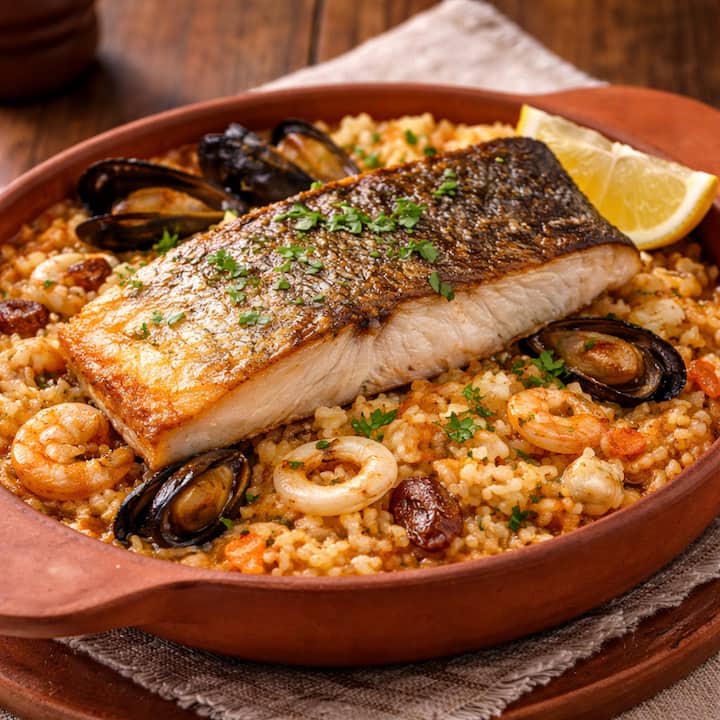 Glavno jelo: Brancin i školjke s umakom bulhão de pato (paradajz, bijeli luk i biber), posluženo s kremastim korijanderom i rižom s limunom