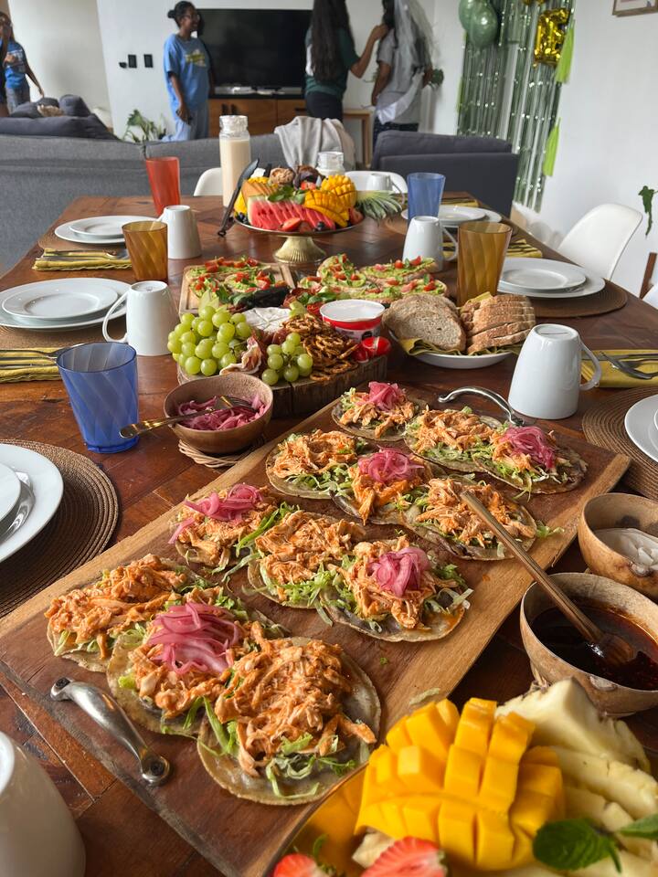 Domaći chilaquiles s piletinom (crveni ili zeleni), domaći panuchosi iz Yucatana punjeni jajima, jaja pripremljena po vašoj želji (kajgana, omlet ili pržena jaja), prženi grah, svježe sezonsko voće, svježi sok i kafa iz kafetijere.