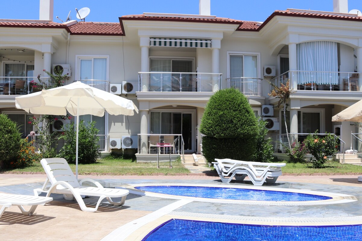 Odličan stan na 2. spratu u Oludenizu. Pješice do restorana, barova, tržnica i sličnih mjesta. 5 minuta automobilom do plaže... Imamo prozor s pogledom na bazen iz dnevne sobe. Vrlo širok pogled na Babadağ će vas dočekati s istog prozora. jedan bračni krevet i jedan krevet za jednu osobu u spavaćoj sobi i kauč na razvlačenje u dnevnom boravku Ukupno je u rasporedu koji može udobno primiti 4 osobe Naša firma je Tursab Grupa putnika.