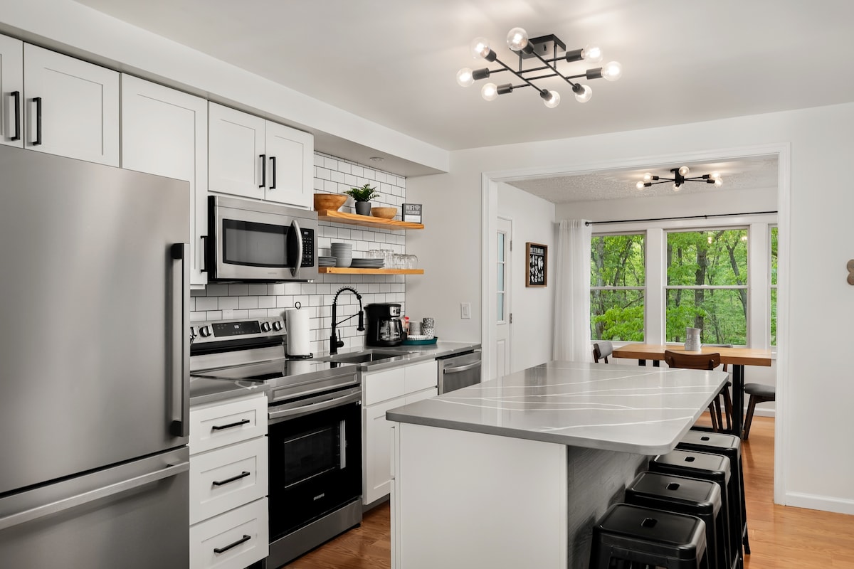 ✦ Praktično se nalazi na pješačkoj udaljenosti od smještaja s kajakom i tubingom u objektu Shenandoah River Outfitters. ✦ Upijajte brige u opuštajućoj masažnoj kadi s pogledom na šumu ✦ Privatni poslovni prostor opremljen brzim Wi-Fi mrežom za neprekidne pozive na Zoomu. ✦ Lijepo uređena, dobro opremljena moderna kuhinja za domaća jela. ✦ Povežite se sa svojim uslugama streaminga na 55" Roku Smart TV-u. ✦ Opustite se na otvorenom uz predviđeni vanjski roštilj, ognjište i prostor za sjedenje.
