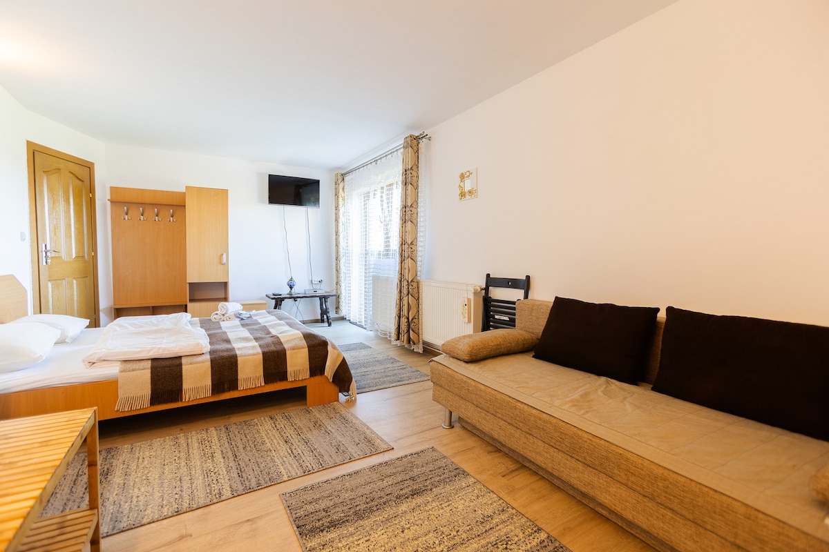 Soba 5 Family – gostoljubiva i prostrana, savršena za 3–4 osobe, u Vila Verde Păltiniș. Privatno kupatilo, balkon i Digi-TV. Udobni kreveti, prirodno svjetlo i pogled na planine. Pristup potpuno opremljenoj kuhinji i dnevnom boravku od 60 m2, terasi i parkingu. Ostava za skije/bicikle. Na zahtjev: iznajmljivanje opreme i časovi SKIJANJA i SNOWBOARDA, na pješačkoj udaljenosti od staze.
