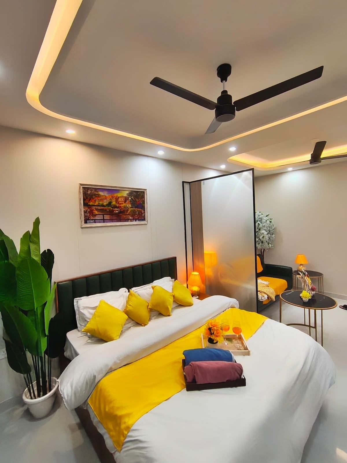 🌼 Svijetli, udobni luksuzni studio apartman s veselom žutom temom vrta. Uživajte u spavaćoj sobi ispunjenoj sunčevom svjetlošću, udobnoj dnevnoj sobi, potpuno opremljenoj kuhinji i šarmantnom balkonu. Savršeno za parove, putnike koji putuju sami ili poslovne goste. Uključuje Wi-Fi, pametni TV, klima uređaj i siguran pristup. Blizu kafića, restorana, trgovina i prevoza za opušten i praktičan boravak. Nalazi se u blizini ulice Golf Course Road, metro stanice Gurgaon Sector 42-43 i škole Shiv Nadar.
