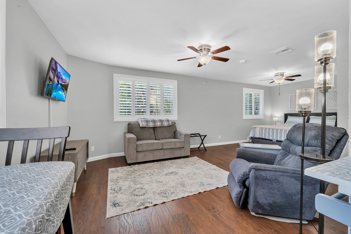 Unwind in our studio guesthouse, tucked away in a peaceful backyard retreat with a large private pool, cabana, massage chair, and hot tub. Immerse yourself in paradise, surrounded by tropical fruit trees, an organic garden, and an aquaponics system. Outdoor bliss awaits for 420 enthusiasts (outdoors only). Mention '420 friendly' while booking to receive a gift of our homegrown, pesticide-free cannabis. Max 2 guests, no exceptions. Kindly review our description and house rules before booking.