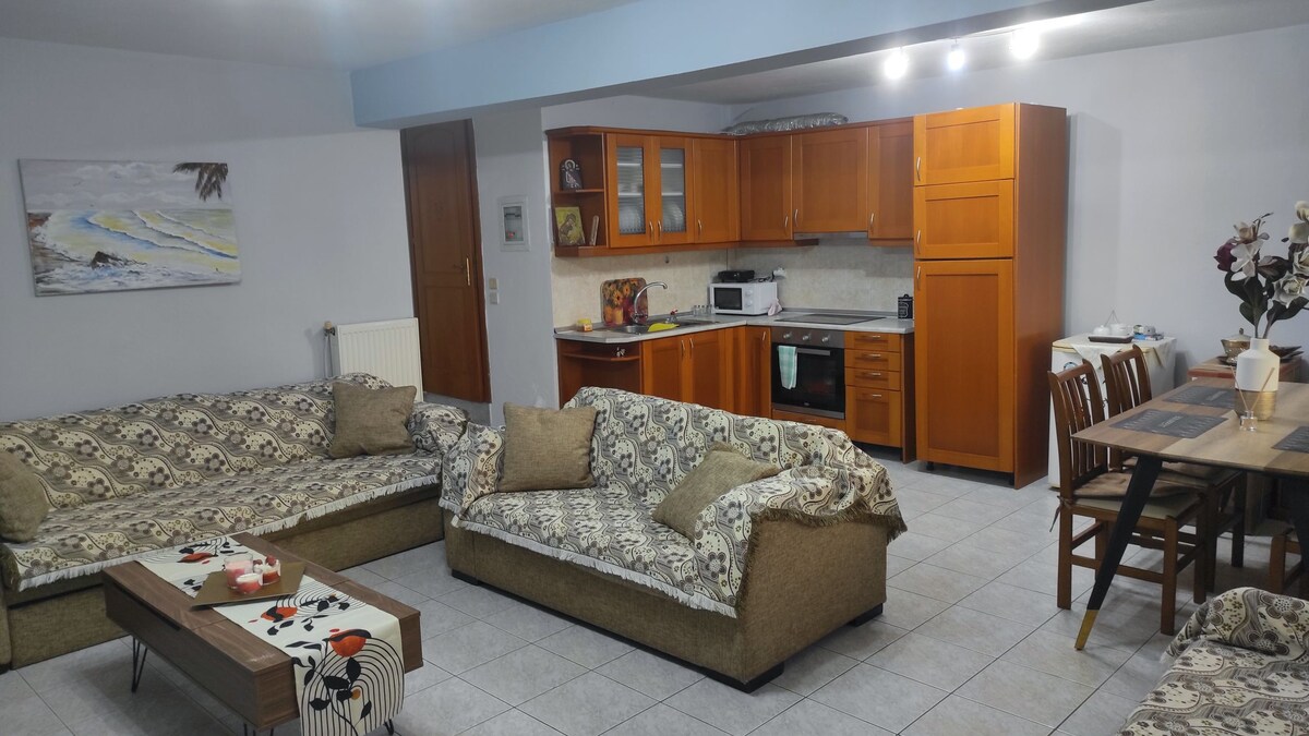 Prostrani (55 m2), čist, lagan i hladan stan u prizemlju sa prekrasnim vrtom. Nalazi se tik uz javni sportski centar s igralištem, a popularna plaža Kalamitsa udaljena je svega 250m hoda. Centar grada (i arheološki muzej) udaljen je 2,5 km, a do njega se može lako doći javnim prijevozom (autobusna stanica udaljena je 100m od kuće). Arheološka lokacija Philippi udaljena je 14 km, a aerodrom Kavala 35 km.