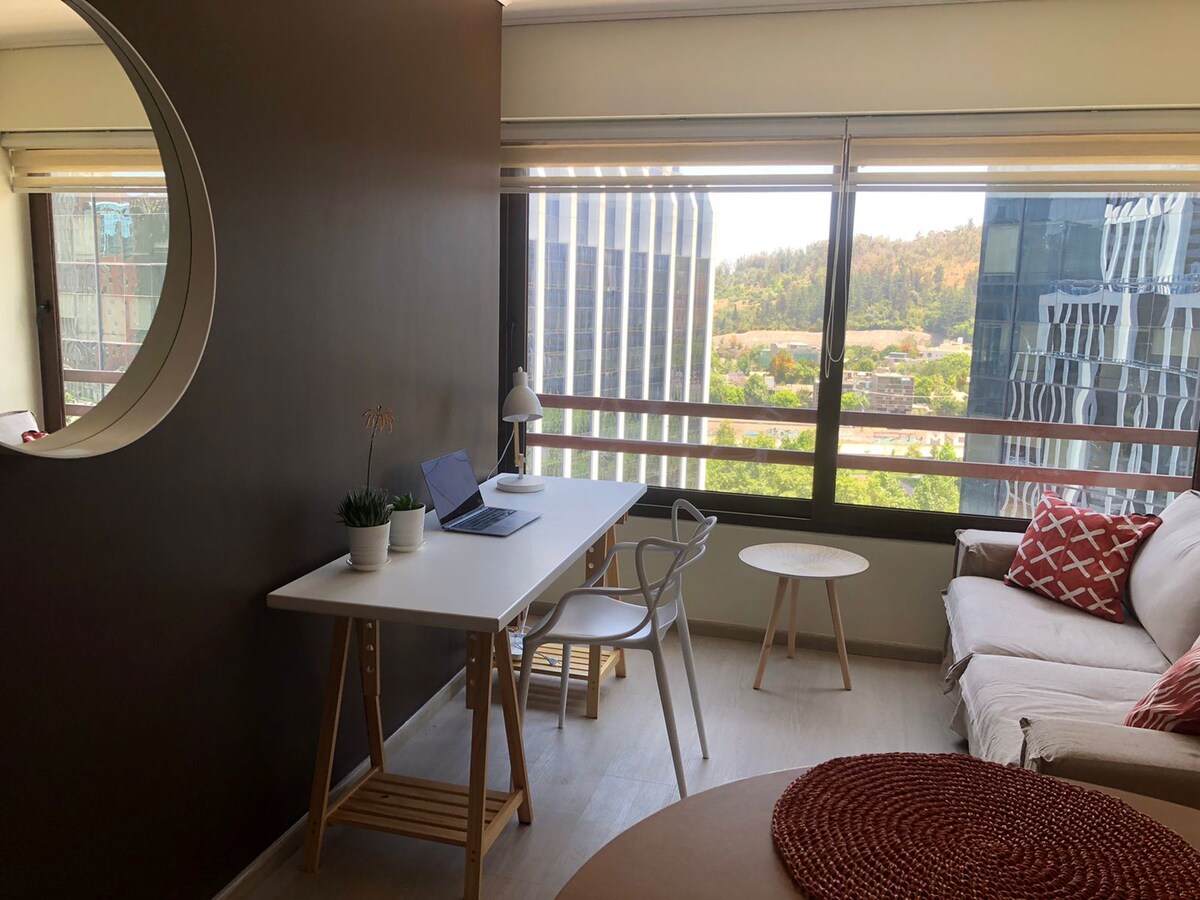 Fantastičan potpuno opremljen studio u Barrio El Golfu, klima uređaj, privatna terasa i pristup bazenu na krovu. Besplatan Wi-Fi Stepenice od stanice metroa Tobalaba izlaz MUT, 4 minute hoda do Costanera Centra, jednog od najposjećenijih mjesta u gradu, sa svojim NEBOM COSTANERA 261 m. visokim i 360° pogledom na Santiago. Nevjerovatna i centralna lokacija u opštini Las Condes, idealna za posjetu gradu zbog turizma ili posla. Uživajte u najboljem što nudi Santiago na vašem pragu!!