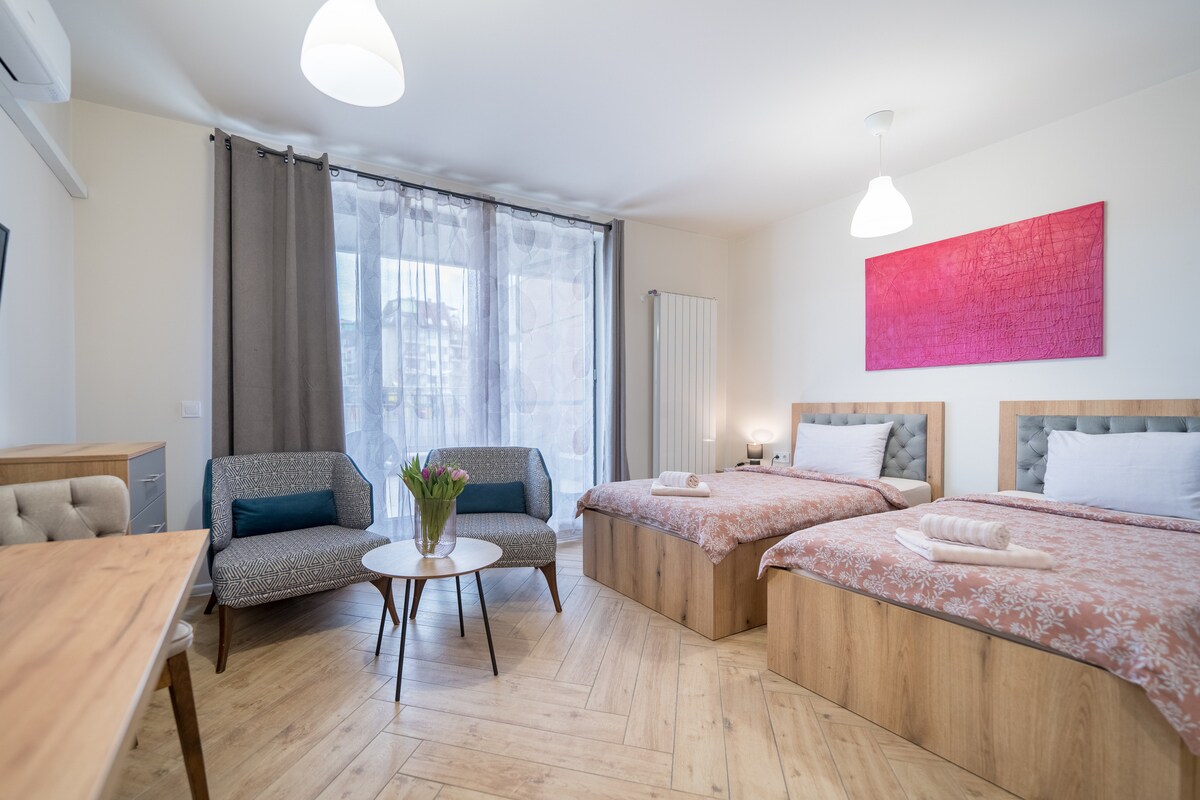 Naš šarmantni i sunčani stan će biti vaš dom dok ste u posjeti Sofiji. Savršeno smješten i potpuno opremljen sa svim potrebnim sadržajima za udoban boravak, naš svijetli, udoban i miran smještaj je savršen za parove, samce, kao i poslovne putnike. Smješteni u srcu grada, brojni pubovi, elegantni kafići i lijepi restorani udaljeni su nekoliko koraka. Metro stanica i autobuske stanice su udaljene 2 minute, a lokacija koju je gotovo nemoguće pobijediti.