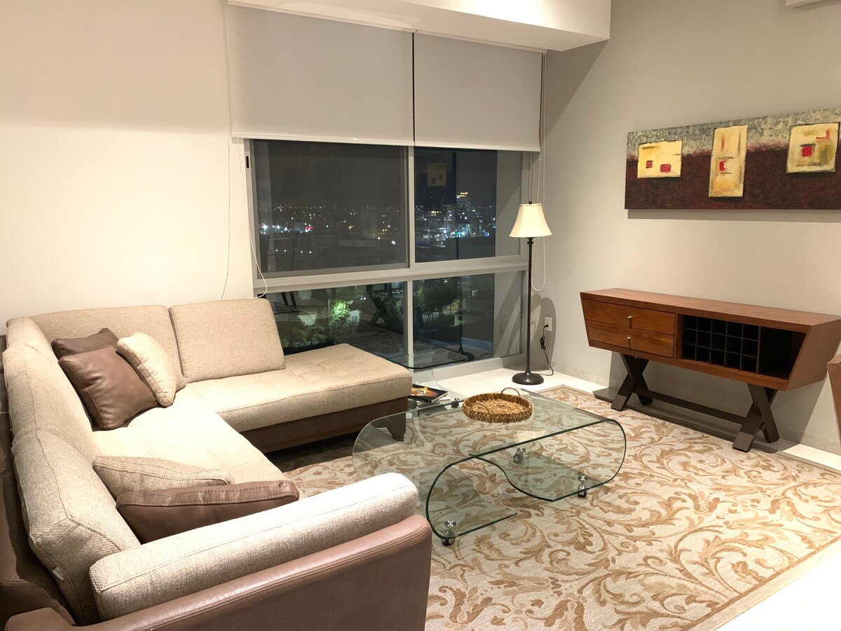 Opustite se u ovom mirnom i elegantnom prostoru, s lijepim pogledom na grad, prostranom spavaćom sobom s KS krevetom, TV-om, klima uređajem, zajedničkim prostorom s terasom, teretanom, prostorom za igru za djecu, koji se nalazi u platinastom dijelu grada, 5 minuta od Plaza San Luís, Plaza The Park i Tangamanga Park. 3 minute od Fresca i HEB, jednostavan pristup Salvador Navi i periferiji. Vratar s nadzornim kamerama. Privatno parking mjesto, bilo zbog posla ili zabave, vaš boravak će biti ugodan.