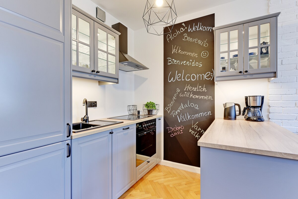 Šarmantni stan u srcu Gdanjska Dobro došli u naš jedinstveni trosobni stan, gdje se šarm i historija susreću u svijetlom i prijateljskom okruženju. Savršeno za porodice, nudimo niz sadržaja, uključujući igračke, udobnu dječju spavaću sobu sa šatorom za igru i svu osnovnu opremu za bebe. U srcu grada, sve glavne atrakcije Gdanjska nalaze se na pješačkoj udaljenosti. Uživajte u ovoj idealnoj lokaciji za istraživanje kulturnih i historijskih bogatstava u blizini.