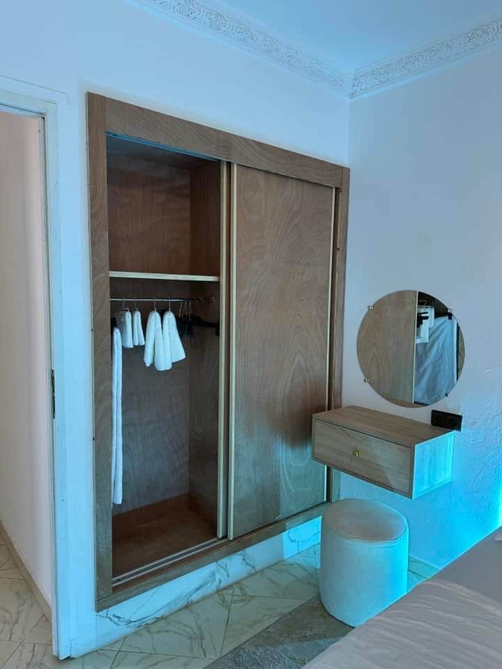 Amusez-vous avec toute la famille dans ce logement chic. Appartement dans une résidence sécurisée et fermée, proche de l aéroport et les plages de Tanger... Un spacieux Salon avec fauteuils de qualité, une smart TV de 50 pouces. une Chambre parentale avec dressing, 2eme chambre avec deux lits séparés et l ensemble avec matelas médicaux Simons. une cuisine bien équipée, tout électrique avec 0 équipement en Gaz pour votre sécurité. une spacieuse douche avec un chauffe eau électrique Junkers.