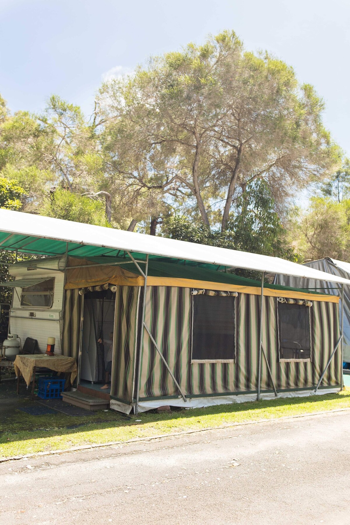 Udobno se smjestite i smjestite u ovaj rustikalni romantični prostor. Ovdje dolazite kako biste pobjegli od buke i pritisaka današnjeg svijeta... Nema Wi-Fi mreže, ograničene su mobilne usluge i nema struje. Opustite se u kadi s pogledom na oblake,čitajte knjigu,slušajte svoju omiljenu muziku,pijte mjehuriće sa sirom i bikijima,kupkom dovoljno velikom za dvoje. Kamp prikolica ima plinsko kuhanje i toplu vodu, sva svjetla se napajaju solarnom energijom,posteljina je isporučena. Prostor za roštilj s odličnim pogledom na grmlje. Dođite jednom i vratit ćete se.