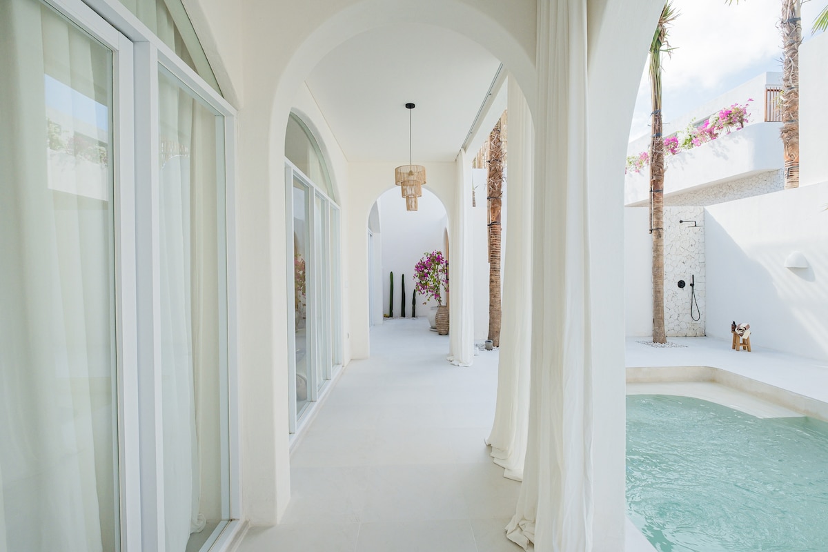 Next to Uluwatus famous Surf Beaches, restaurants & attractions, this villa offers the perfect blend of complete privacy, luxury plus access to everything you need. Step into a Mediterranean dream at our newly built huge fully private 1-bedroom villa, in the heart of Uluwatu. Featuring a private pool, cozy living area with a huge sofa and smart TV, and a fully equipped kitchen, it’s designed for pure relaxation. Enjoy fast Wi-Fi, magical night lighting.
