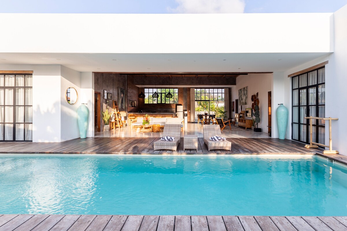 Moderna, otvorena konceptualna vila udaljena nekoliko minuta hoda od plaže Batu Bolong (Old Man 's i The Lawn) u srcu Canggua. Tri lagane i prozračne spavaće sobe, sve s pripadajućim kupatilima, bračnim krevetima, klima-uređajem, ventilatorom i zavjesama za zamračivanje. Opustite se u bujnom vrtu i rashladite se u bazenu. Nekoliko minuta hoda do nevjerovatnih restorana (Mason, Milk & Madu, Luma, Billy Ho...), surfanja, shoppinga, spa centara, teretana i joge. Imamo menadžera vile koji vam svakodnevno može pomoći sa svime što vam je potrebno. Dostupan sam online.
