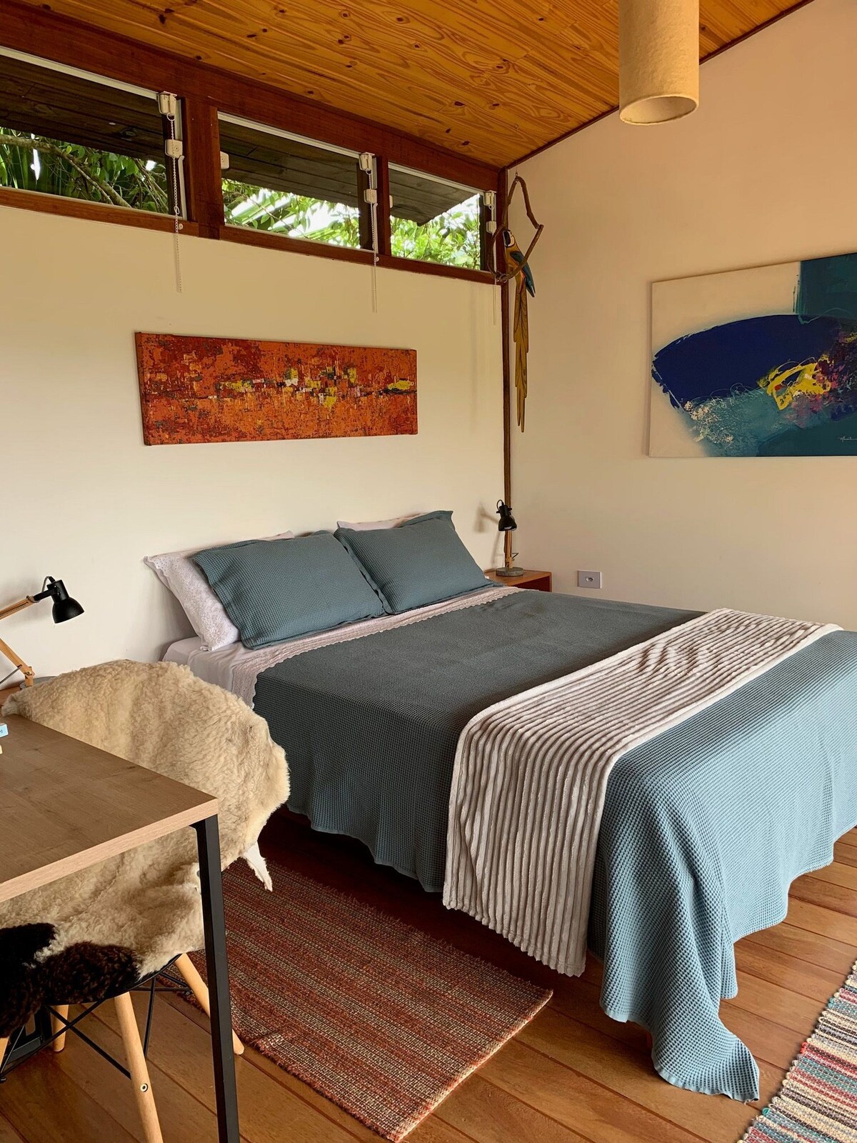 Exclusive and secluded property projected by award winning architect within the Atlantic Rainforest with an amazing and unique view to the Bay of Paraty. The view can be enjoyed from the bed or from the enchanting balcony just outside the room. Room with A/C, private toilet and a fully equipped kitchen. Wi-fi included. There's a beautiful and peaceful sandy beach less than 50 meters away and accessed (by foot) through the property.