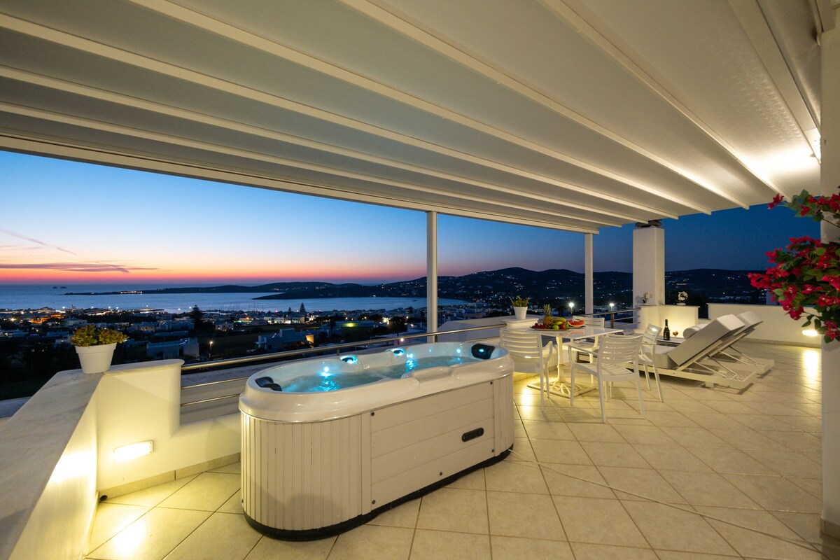 Apartman Panos je elegantan apartman koji se nalazi u Parikoi, glavnom gradu Parosa, a udaljen je samo 800 m. od luke i kozmopolitske plaže Livadia. Uživajte u ovom otvorenom i luksuzno namještenom apartmanu (80 m2) sa svojim velikim privatnim balkonom (100 m2) i prekrasnim pogledom na prirodni zaljev Paroikia. Nikada nećete zaboraviti jedinstvene zalaske sunca i pogled na okolne otoke Serifos, Sifnos i Syros.