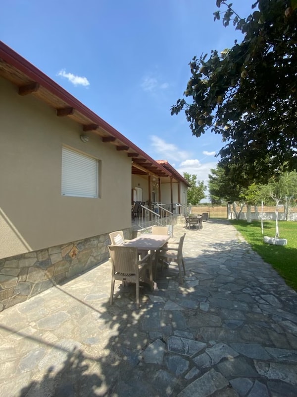 Novoizgrađeni dom, pažljivo uređen, prekrasan sa svim sadržajima kako bi se osigurao ugodan boravak. TV, klima-uređaj, obje spavaće sobe imaju anatomske hipoalergenske madrace i jastuke. Veliko kupatilo sa fenom za kosu i veš mašinom. Velika privatna terasa sa stropnim ventilatorom i ležaljkama u dvorištu.Vanjski tuš. Samo nekoliko koraka uz more.U blizini se nalaze taverne, SM, trgovine, kafići i barovi.Aerodrom u Solunu udaljen je oko 35 km, a samo 13 km je pećina Petralona Halidiki.